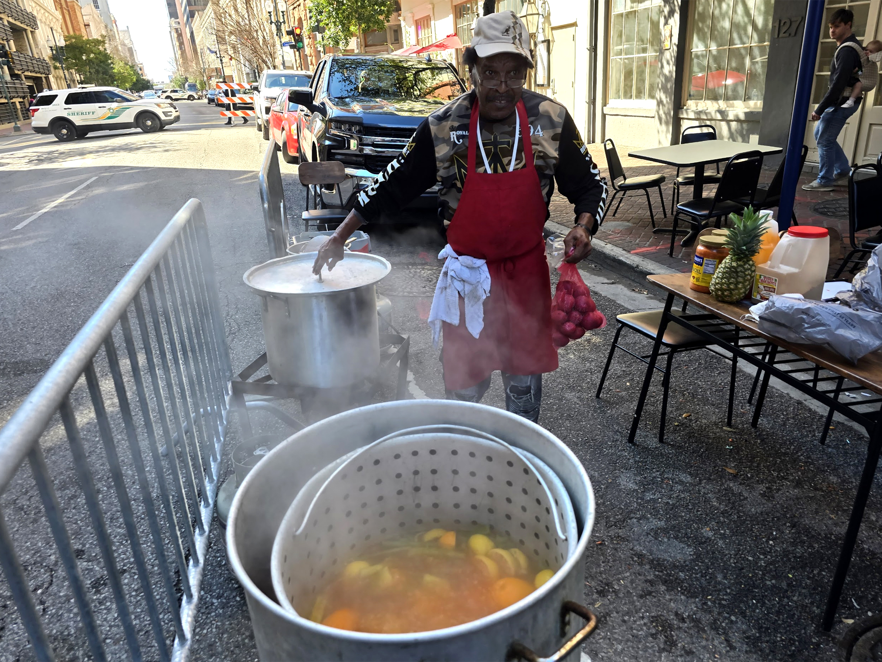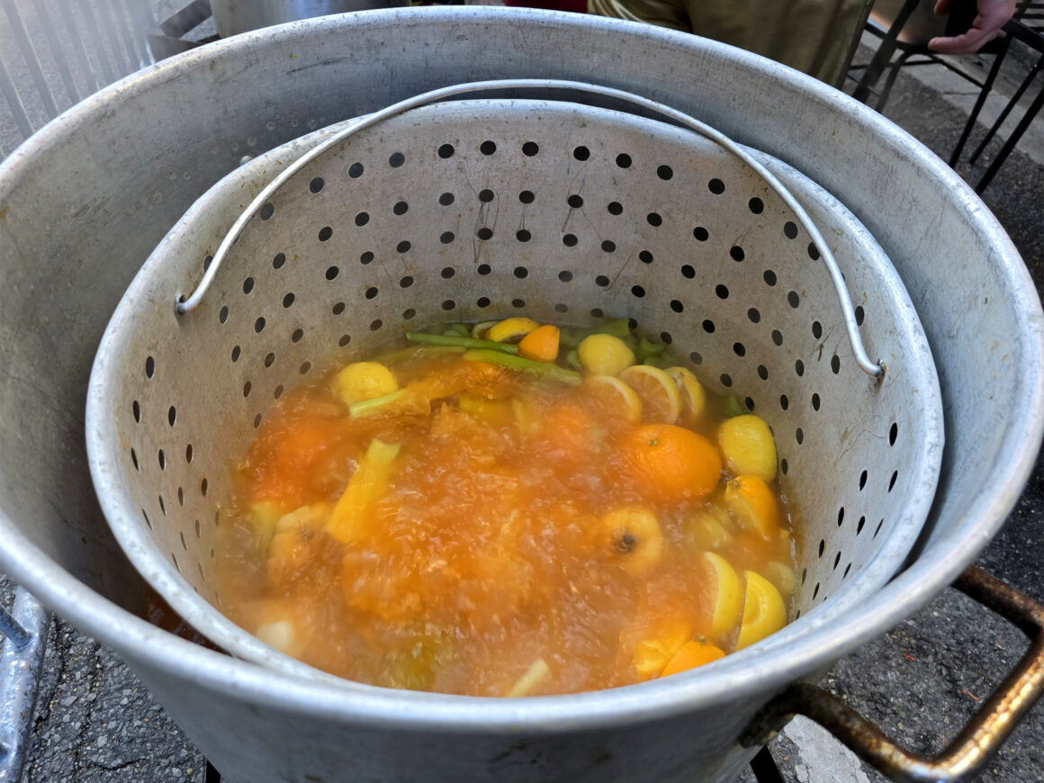 Chef Joe’s name is on the sign, but it was clear that Aaron runs the kitchen. I asked if I could get some photos and he obliged by welcoming me into his makeshift outdoor kitchen, all the while happily answering our questions saying, “This is a teaching kitchen.” He told us he was 75 years old and had been cooking for 57 years.