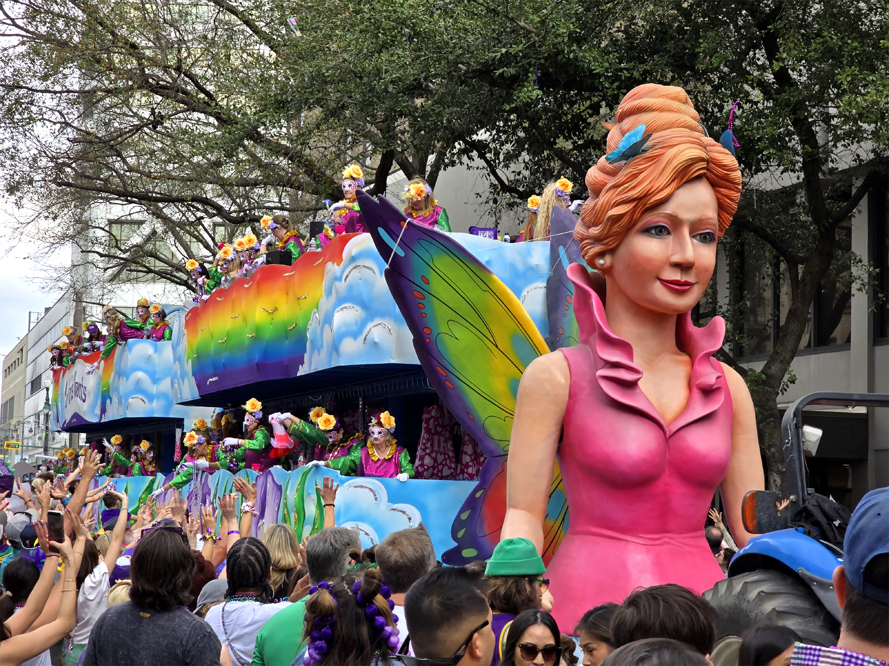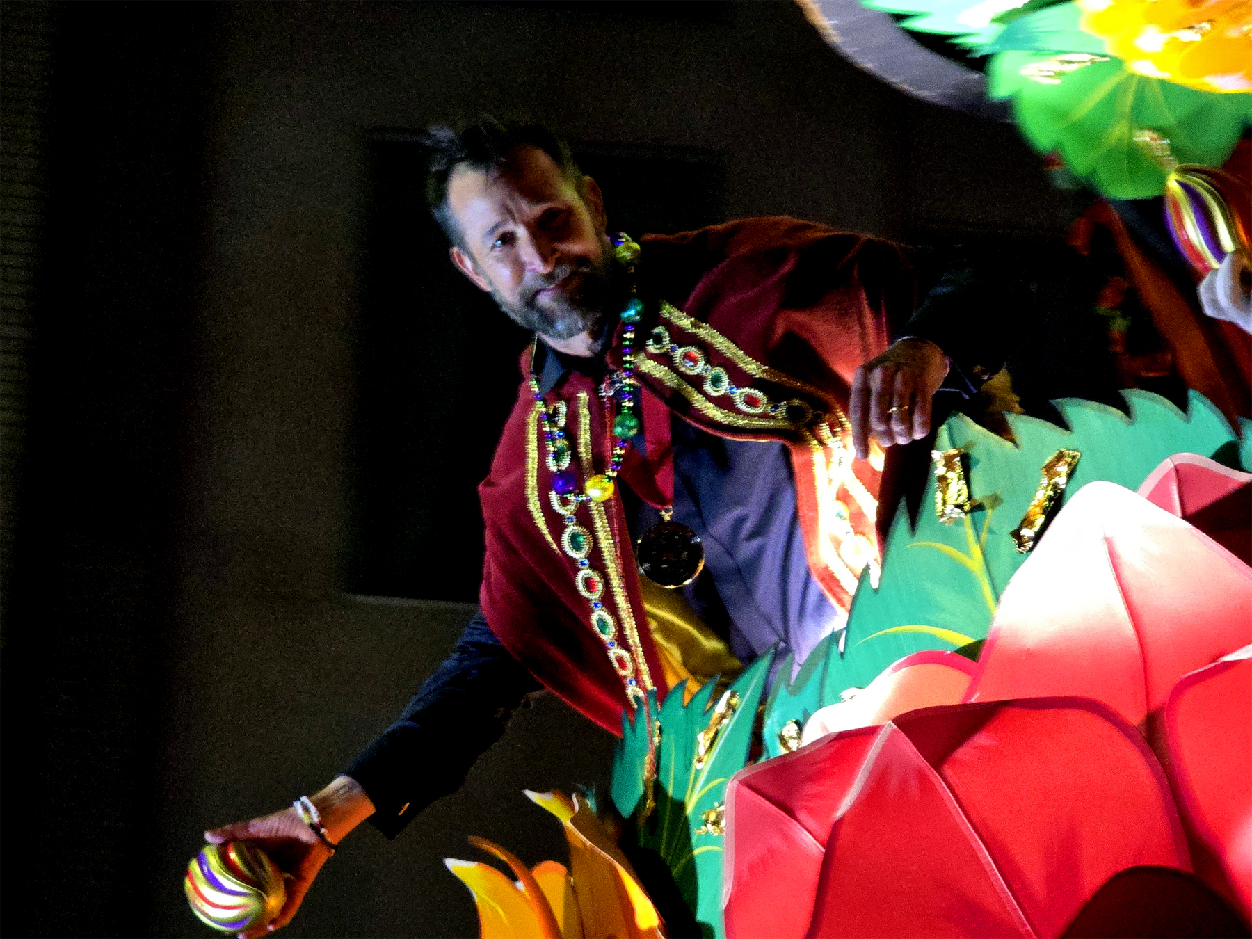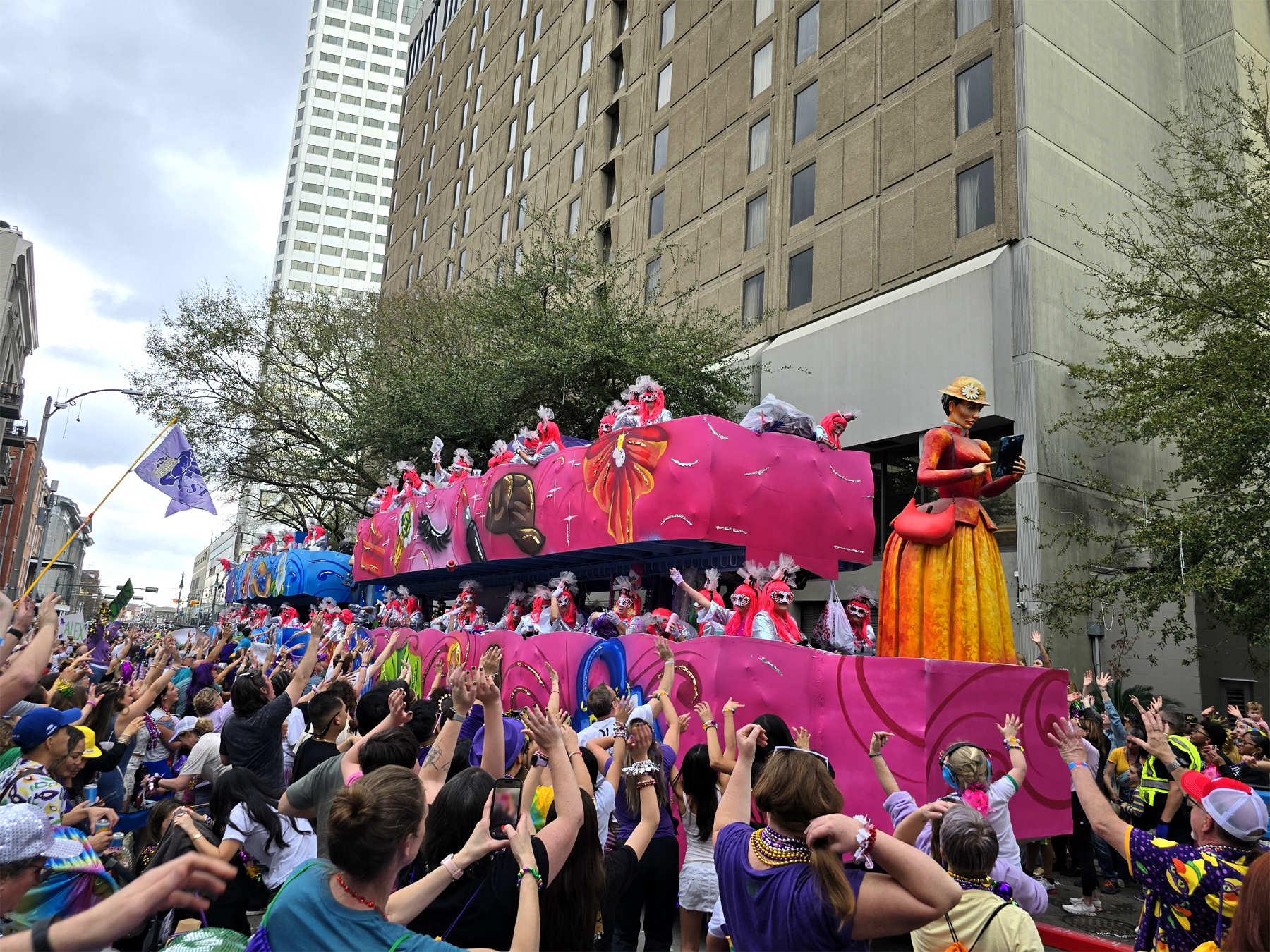 We parked our camp chairs along the parade route, at the corner of Gravier St and Tchoupitoulas St, outside of the elegant Restaurant August, which I would love to visit for a special occasion someday. After claiming our ground amongst the gathering throng, we left our chairs for the first of several visits to Little Bar on Gravier, which was just a block away. Little Bar ended-up being one of our favorite places. This modest dive bar was essentially our base of operations for the whole trip. It was a good place to rendezvous with Andy, who knew the bar as Chuck’s from back in his day. Then we spent the day watching the parades until we needed a break and then we would walk to Little Bar for rest and refreshment. Rinse and repeat.