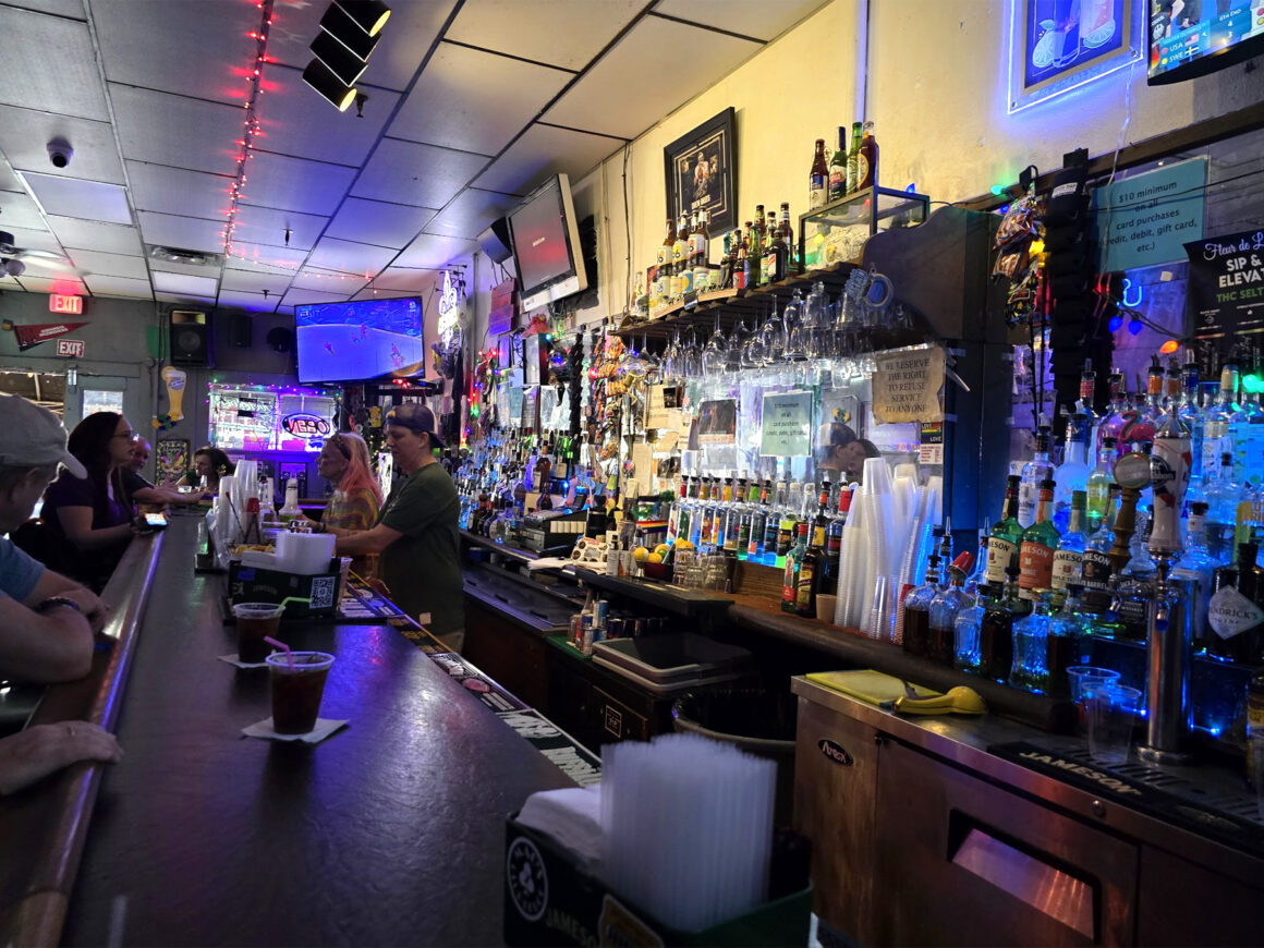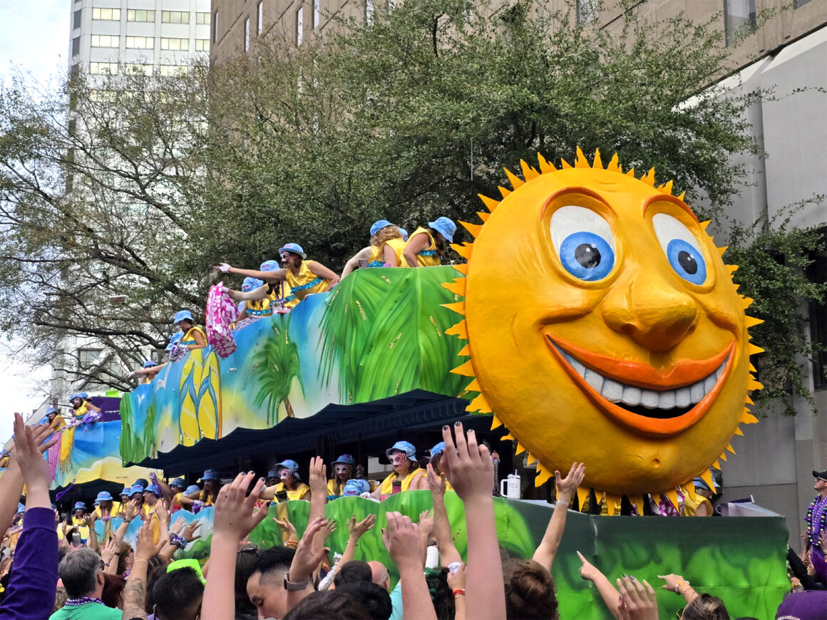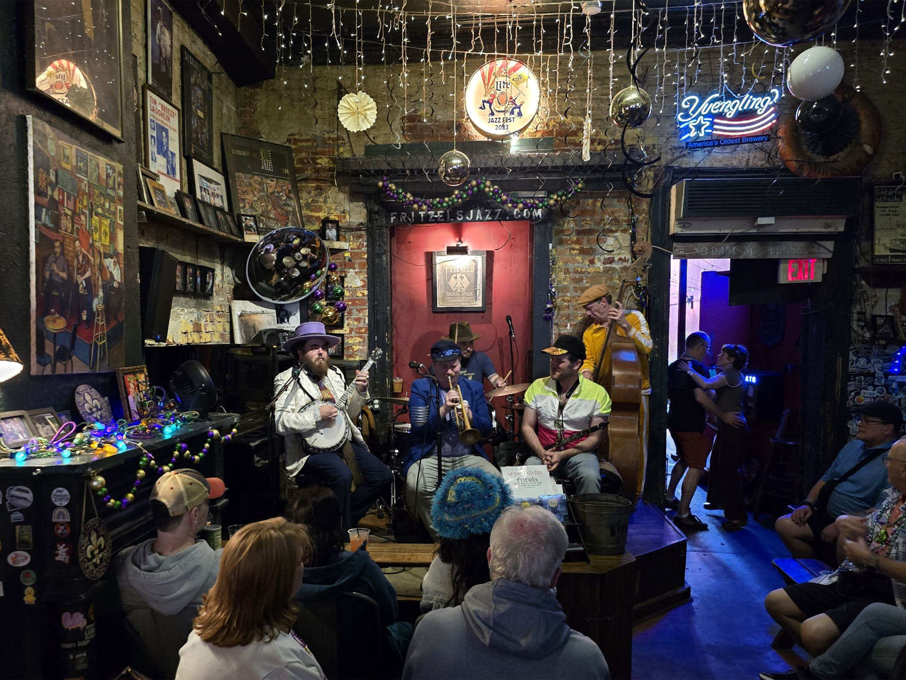 We parked our camp chairs along the parade route, at the corner of Gravier St and Tchoupitoulas St, outside of the elegant Restaurant August, which I would love to visit for a special occasion someday. After claiming our ground amongst the gathering throng, we left our chairs for the first of several visits to Little Bar on Gravier, which was just a block away. Little Bar ended-up being one of our favorite places. This modest dive bar was essentially our base of operations for the whole trip. It was a good place to rendezvous with Andy, who knew the bar as Chuck’s from back in his day. Then we spent the day watching the parades until we needed a break and then we would walk to Little Bar for rest and refreshment. Rinse and repeat.