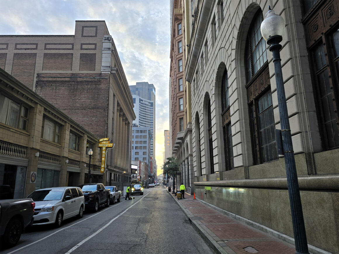 We walked to Camp Street to have breakfast at the popular Cafe Fleur de Lis, but there was a 45-minute wait. So we walked a block over to try Majoria’s Commerce, but as we approached, we could see the queue was out the door. We walked back Cafe Fleur de Lis and put our name on the list and then walked next door and sat at a shaded table in front of Downtown at TaTa’s, which appeared to be closed.